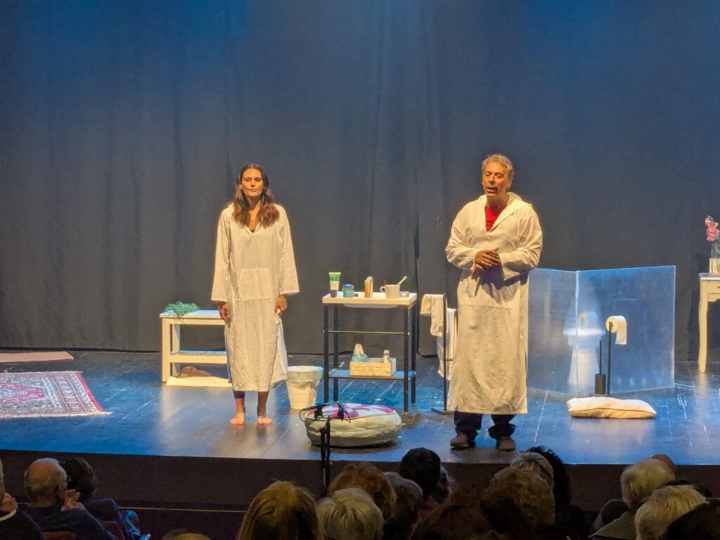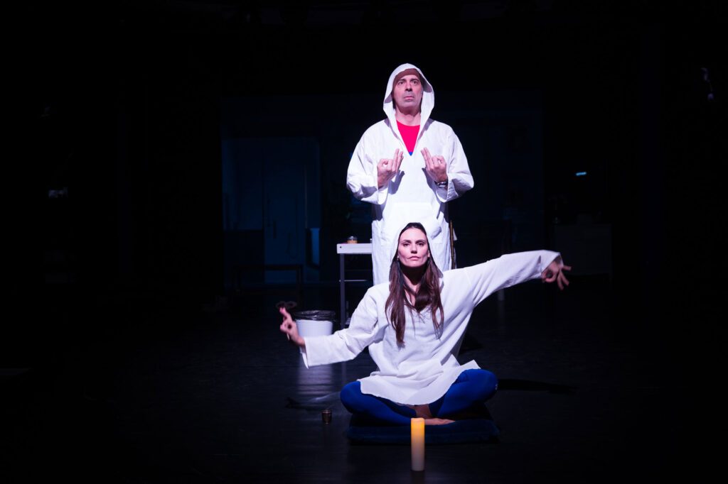 “L’ispirazione a scrivere questa commedia – racconta De Santis – l’ho avuta durante il passato lockdown. Mi ero circondato di libri, perché stavo approfondendo molti aspetti delle varie religioni e dello yoga, così mi sono detto che potevo tirarne fuori qualcosa. Quindi le battute che recitiamo sulla scena, ad esempio quando si parla dei chakra, riportano cose che non sono frutto della mia inventiva. La particolare ambientazione in un unico spazio ristretto, il bagno di casa, forse è dovuta proprio al fatto che in quel periodo eravamo tutti costretti a stare chiusi dentro le nostre abitazioni.”